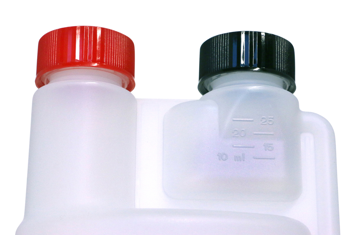 To dispense, unscrew the black cap to relieve any pressure and then carefully squeeze the main body of the bottle to force the contents into the measuring chamber. Do not remove the black cap fully – this will ensure that the contents will not squirt out from the chamber. Continue this until the correct measurement is achieved and then remove the black cap fully and pour, ensuring that a suitable funnel is used where necessary.