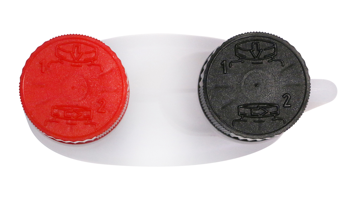 Each bottle is supplied with 2 child protective caps. The black cap is for the dispensing chamber and the red cap for refilling the bottle. To fill the bottle unscrew the red cap and pour the product into the bottle using a suitable funnel, taking care not to overfill.