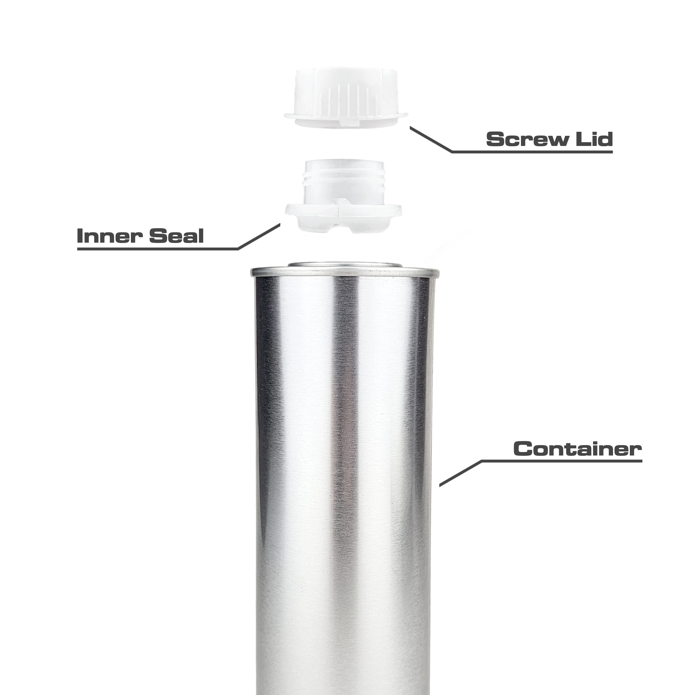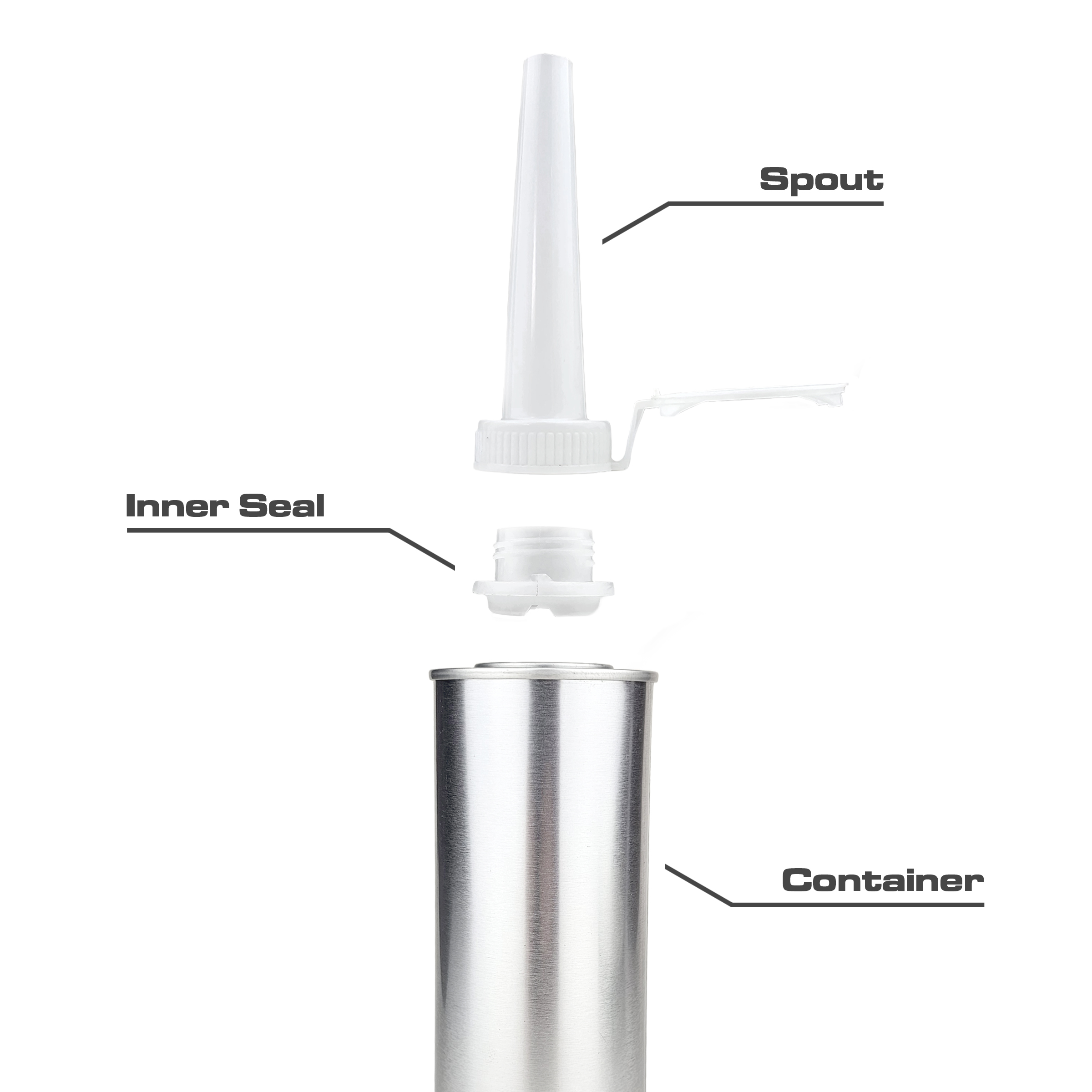 Simply add the contents and then push the cap assembly onto the can to seal the contents and create an aerosol-like can with a screw top lid and pull-ring seal. A threaded spout screws onto the can to aid pouring is also supplied.