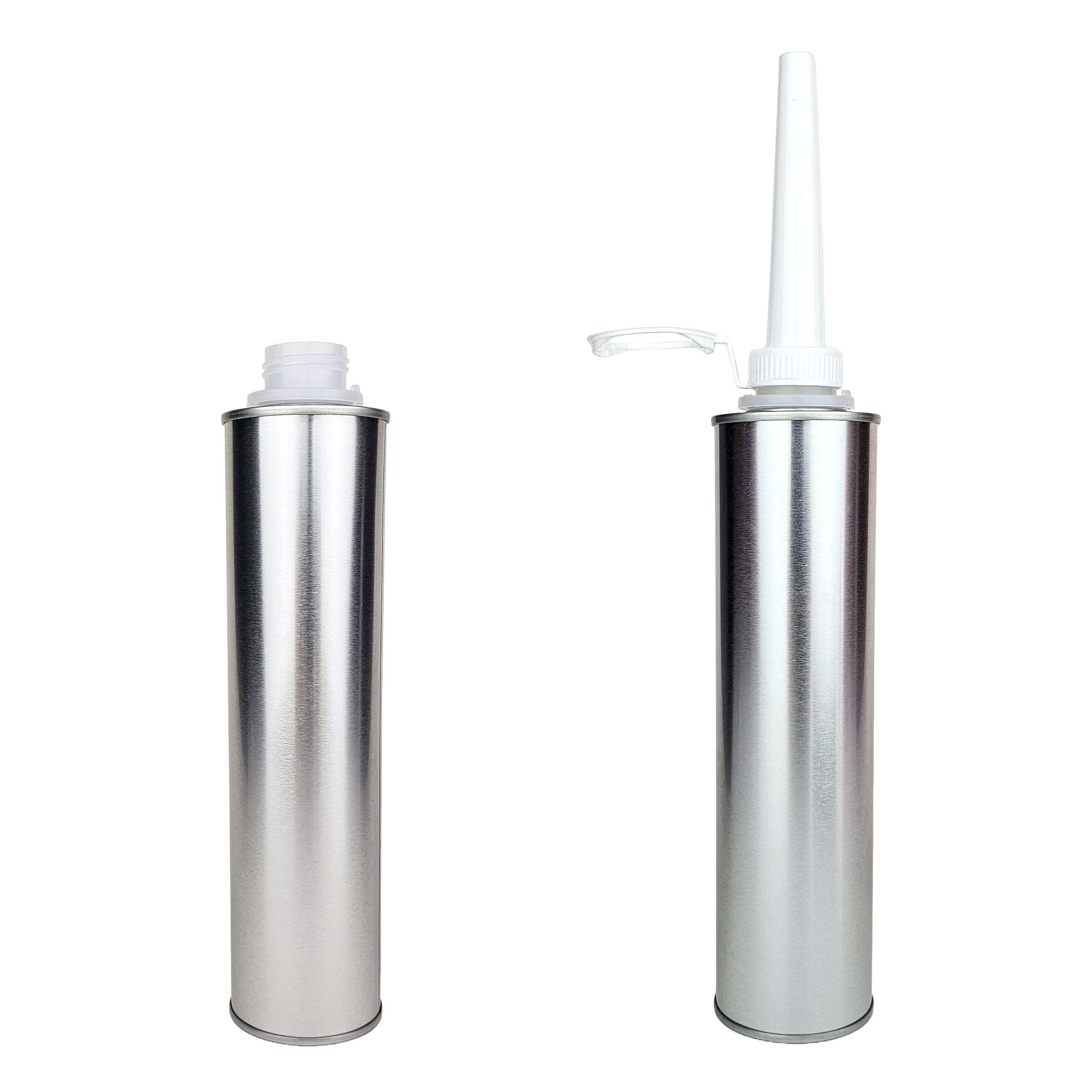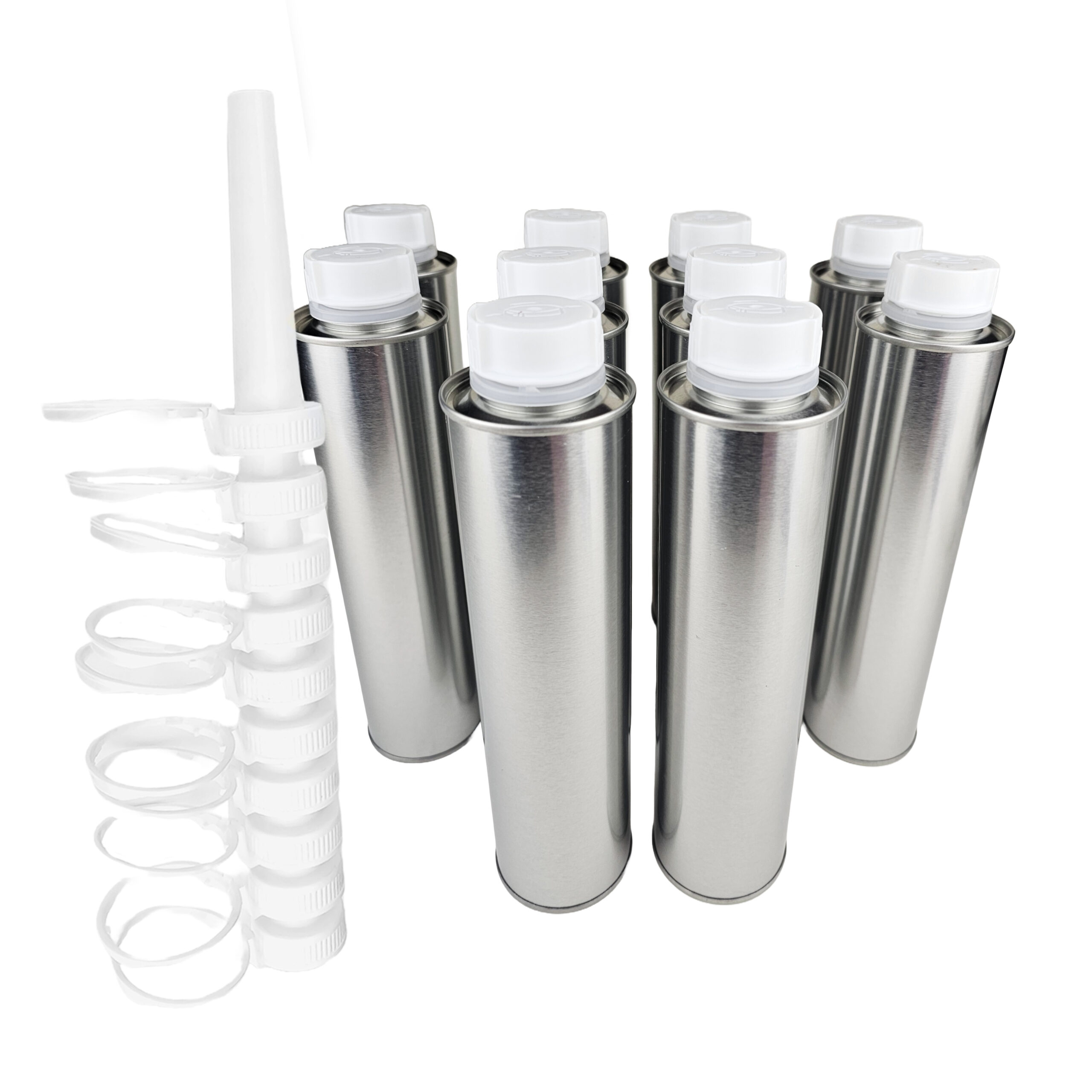 Simply add the contents and then push the cap assembly onto the can to seal the contents and create an aerosol-like can with a screw top lid and pull-ring seal. A threaded spout screws onto the can to aid pouring is also supplied.