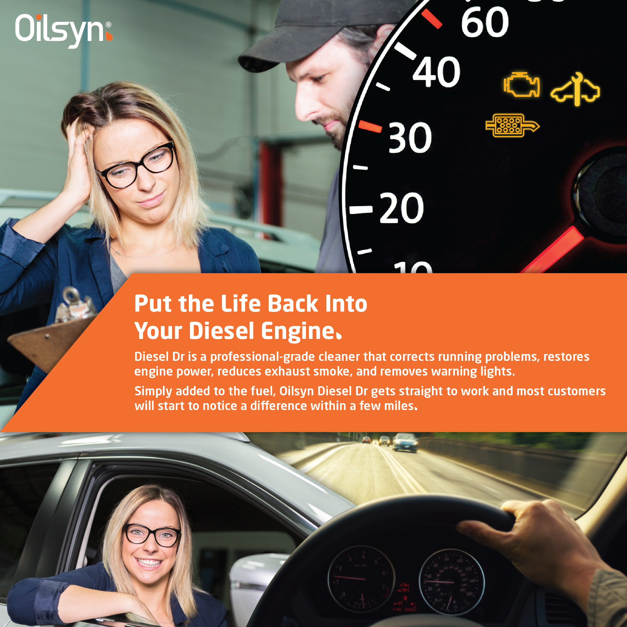 • Simply added to the fuel, Oilsyn Diesel Dr gets straight to work and most customers will start to notice a difference within a few miles.
