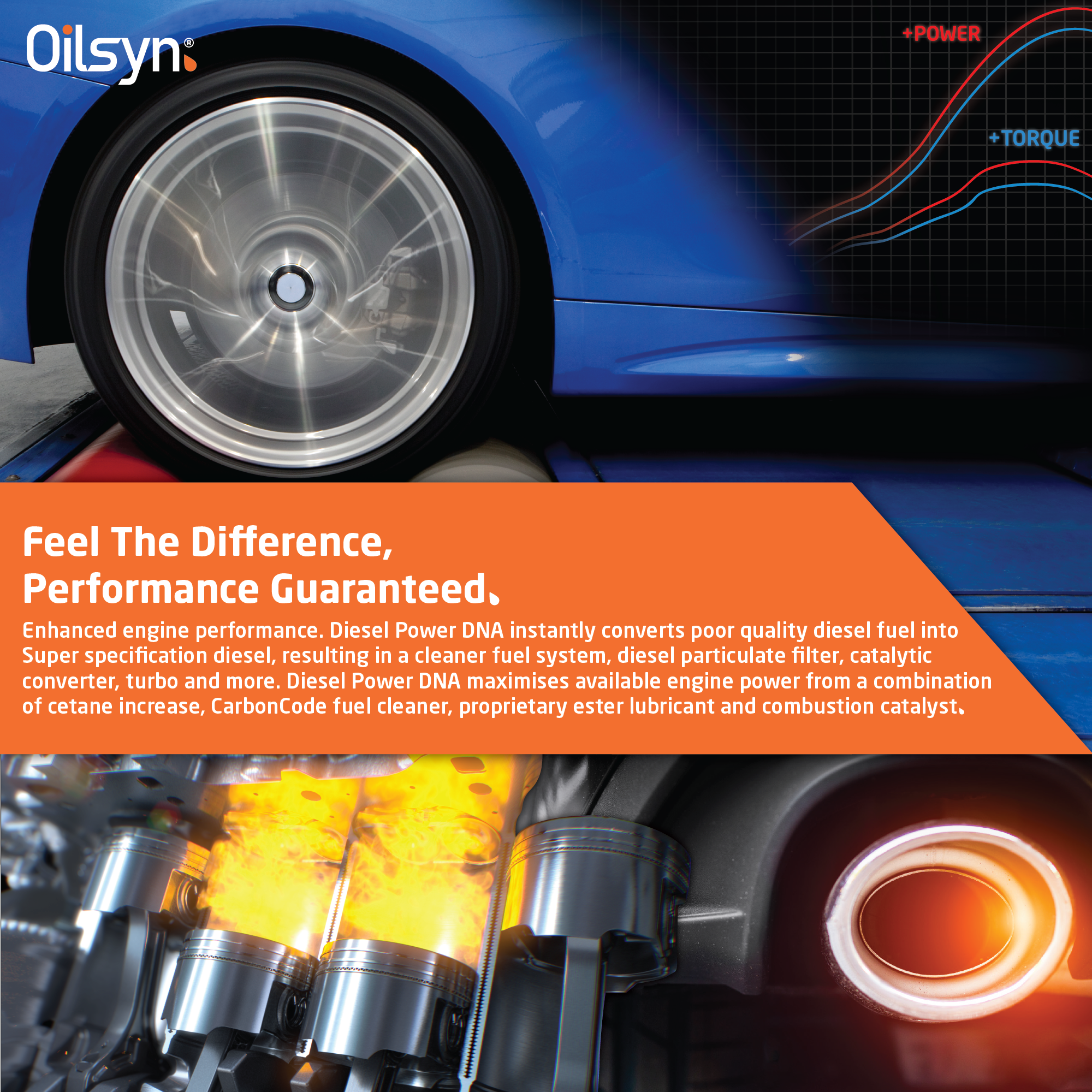 Diesel Power DNA converts regular diesel into a premium Super diesel fuel by maximising available engine power from a combination of cetane increase, CarbonCode fuel cleaner, proprietary ester lubricant and combustion catalyst.