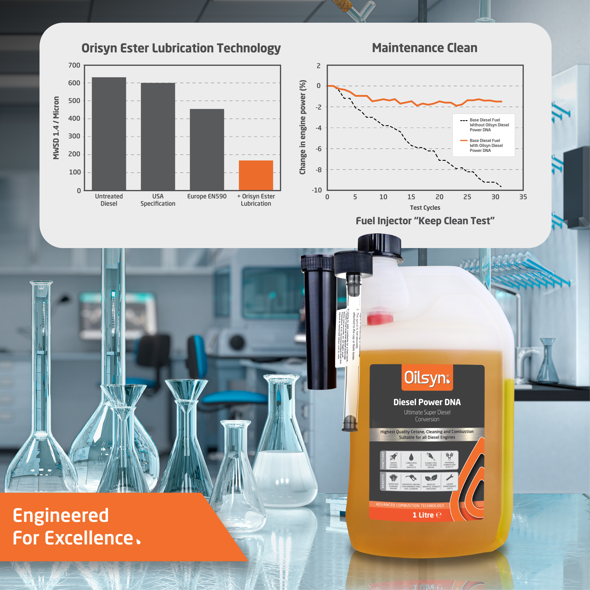 Oilsyn’s CarbonCode detergent pack ensures existing fuel system deposits are removed, and the system remains clean for maximum continual performance and fuel efficiency. Oilsyn’s Orisyn proprietary ester-based lubricant outperforms conventional diesel fuels lubricants or 2-stroke oil used as a diesel additive, with an HFRR well below 200, which is an industry first.